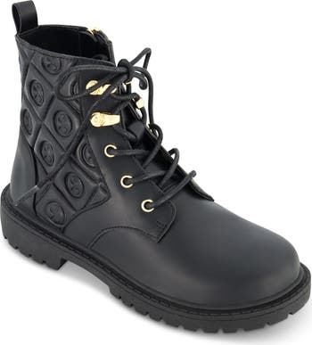 Embossed logos and polished hardware add a luxury finish to a combat-style boot with a tough traction grip sole, perfect for the playground.