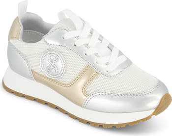 Mixed metallic trims and diamond-knit mesh cover an athletic-style sneaker finished with traction grip sole perfect for the playground.