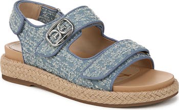 Espadrille-inspired braiding enriches the earthy style of a woven sandal complete with a slingback strap.