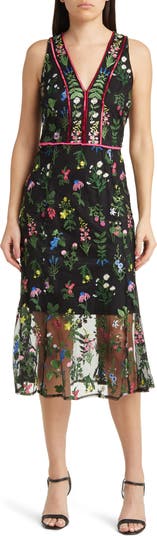 Beautiful botanical embroidery brings vibrancy to any season on a sleeveless dress detailed with a deep V-neck and floaty, semisheer skirt.