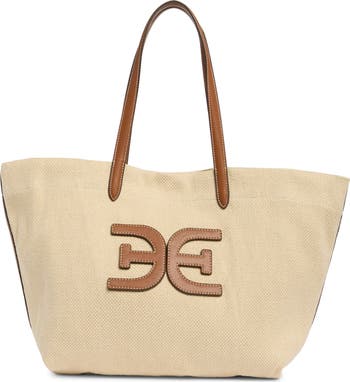 Exude beachy style with this breathable cotton-linen blend tote bag framed by soft faux-leather shoulder straps and a stitched faux-leather logo.