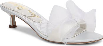 A gauzy bow adds a flash of glamour to an occasion-ready sandal set on a low heel.