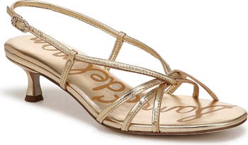 Tubular straps intertwine over the vamp of a slingback sandal set on a tapered kitten heel for modern style and a hint of lift.