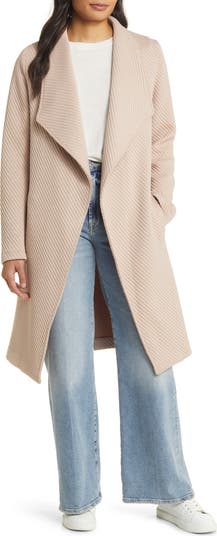 Soft ribbing textures this longline jacket crafted with winged lapels and a layer-perfect open front.