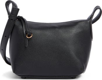 A subtle foiled logo brings signature styling to a pebbled faux‑leather crossbody bag fitted with a compact interior and an adjustable strap.