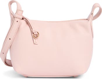 A subtle foiled logo brings signature styling to a pebbled faux‑leather crossbody bag fitted with a compact interior and an adjustable strap.