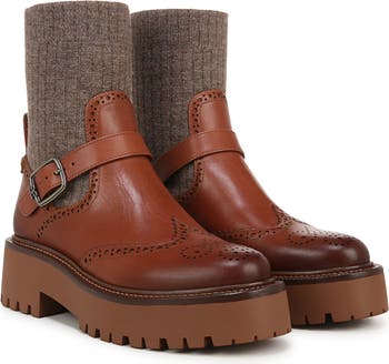 A wingtip toe with brogue trim and gleaming buckle strap add polished appeal to this lug-sole boot fitted with a ribbed sock-like collar for comfort and easy entry.