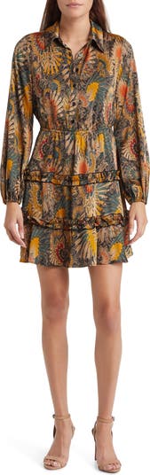 Mesmerizing geometric shapes create a nature-inspired print on this ruffle-hinted mini shirtdress perfected by chic contrast merrow stitching.