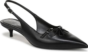 A buckle-accented strappy detail highlights the pointy toe of this poised slingback pump lifted on a demure kitten heel.