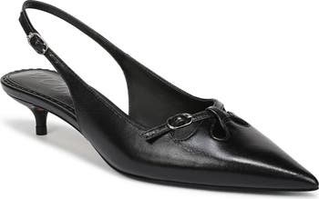 Dainty keyholes enhance the sophisticated style of this shiny patent-leather slingback pump balancing a chic pointed toe with a modest kitten heel.