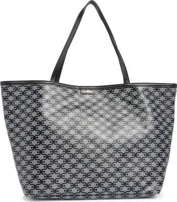 A monogram logo pattern exudes signature appeal on a spacious tote designed for easy organization while on the go.