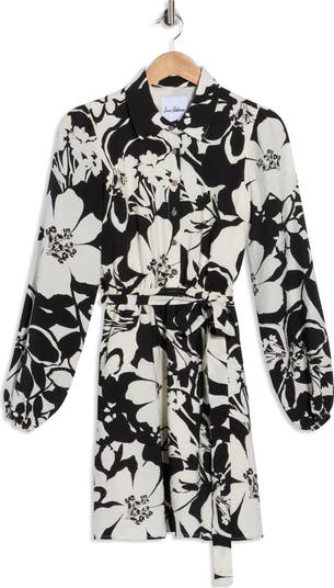 Stark black‑and‑white blooms bring a modern edge to this shirtdress framed by long sleeves and cinched with a tie belt.