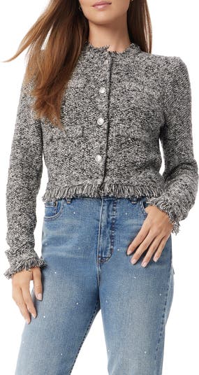 Decorative pockets and fringe trim add just the right note of modern flair to this classic button-front jacket.