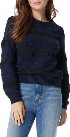 Lacy insets and scrolling cable stitches charm this crewneck sweater knit from a soft cotton blend in a fit that's great whether layered or starring solo in your look.