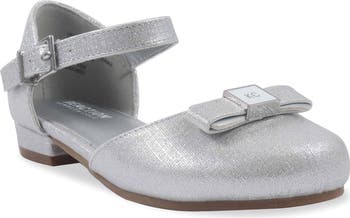 A neatly folded bow tops an occasion-ready shimmering flat secured by a buckled strap.