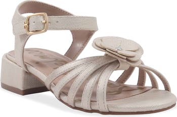 A jewel-centered floral appliqué sits atop a strappy metallic sandal set on a cushioned footbed and low block heel.