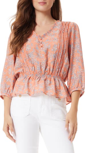 Lace-trimmed pintucks texture a blousy floral-print top designed with billowy sleeves and a flouncy hem for fluttering movement.