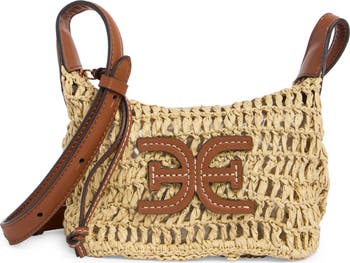 Gorgeously woven raffia and rich faux-leather accents elevate a compact crossbody bag equipped with an adjustable shoulder strap.