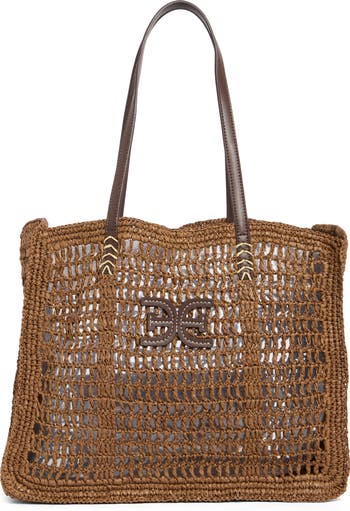 Glamorize your on-the-go look with a roomy tote bag crafted from intricately woven raffia with smooth faux-leather accents.