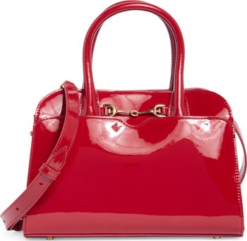 Polished bit hardware and a glossy finish lend shine to a satchel bag that can be carried by top handles or the included crossbody strap.