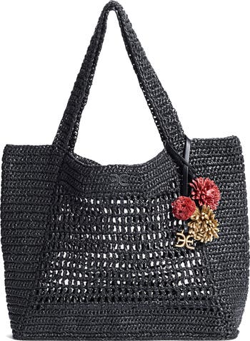 Openwork detailing brings airy charm to this roomy tote intricately woven from paper raffia and finished with a playful flower charm and logo hardware.