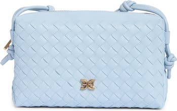 Polished hardware subtly brands this structured crossbody bag that's covered in a richly woven texture and has a satin lining to keep essentials safely stowed.