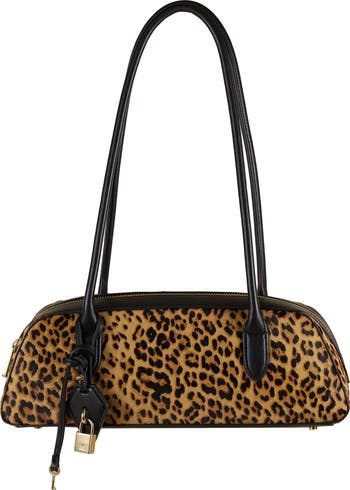Engraved logo hardware and a bowler-inspired silhouette distinguish a compact satchel made from genuine calf hair and fitted with an optional crossbody strap for hands-free wear.