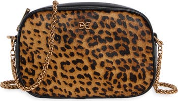 Leopard-print genuine calf hair stands out against the leather exterior of a structured camera bag fitted with an adjustable shoulder strap for hands-free wear.