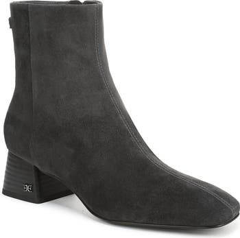 Signature logo hardware details the heel counter of a luxe bootie balanced by a squared-off toe and stacked block heel.