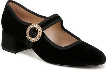 A polished Mary Jane pump dazzles with a rhinestone-embellished buckle crafted from luxe velvet and lifted by a low block heel for timeless charm.