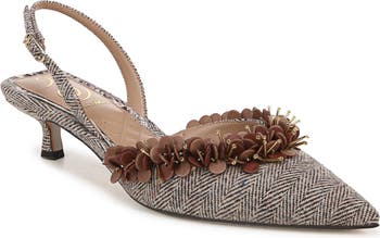 Glossy embellishments trim the instep of a soirée-ready slingback pump framed by a pointy toe and kitten heel.