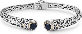 This Balinese-inspired cuff bracelet glittering with round bezel-framed tips is masterfully cast and handcrafted from high-polish sterling silver detailed with 18-karat yellow-gold accents.