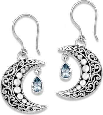 Celestial energy exudes from these polished filigree earrings suspending crescent moons shimmering with blue topaz teardrops.