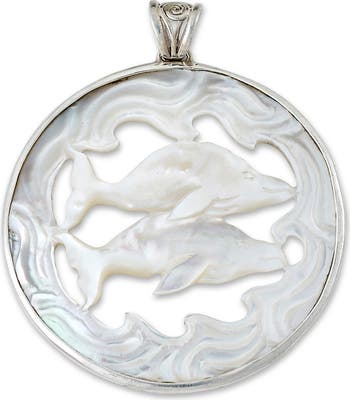 Grafeful dolphins swim across a carved mother-of-pearl disc that captures the beauty of the sea in a handcrafted sterling silver pendant sure to charm any look.