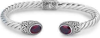 Faceted blue topaz stones sparkle at each end of this open sterling-silver cuff bracelet handcrafted with twisted detail and ornate engravings.