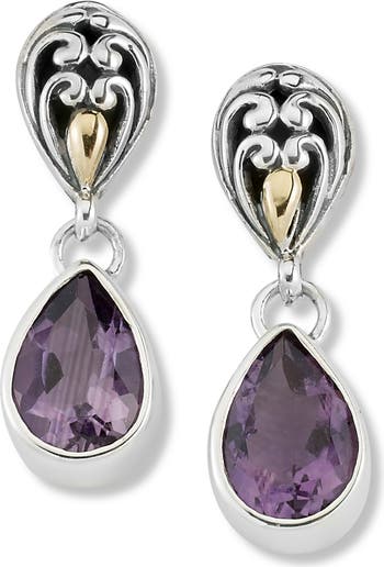 Polished 18-karat gold accents detail the engraved studs of these earrings suspending teardrop-cut amethyst stones.