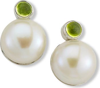 Large faux-pearl drops give an air of elegance to these statement-making earrings complete with peridot-adorned posts.