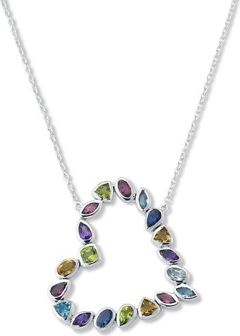 Sparkling semi-precious bezel set stones compose an open heart pendant necklace in lustrous sterling silver for instantly chic, romantic style.