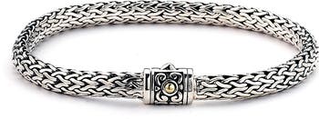 Intricate, woven detailing characterizes this sterling silver and 18k gold bracelet.