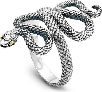 An 18-karat gold accent shimmers atop a snake-inspired ring handcrafted from sterling silver with Balinese-inspired details.