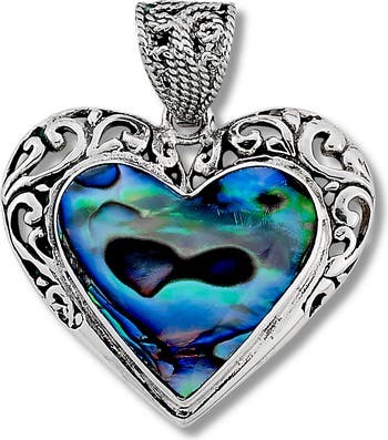 A sterling silver pendant in the shape of a heart is accented with abalone shell.