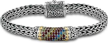 Pavé semiprecious stones bring focal sparkle to a woven-chain bracelet crafted from polished sterling silver and warm 18-karat yellow gold.