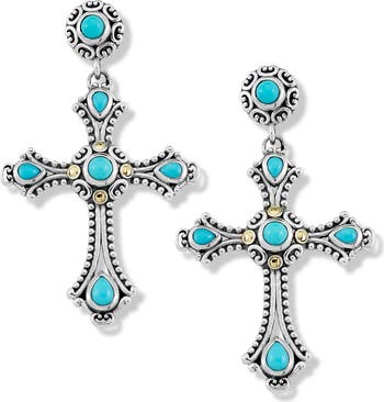 Turquoise stones bring vibrant color to ornate filigree cross drop earrings crafted from polished sterling silver and 18-karat gold.