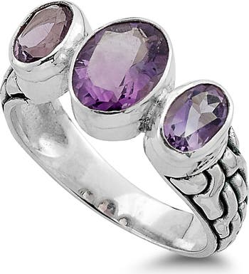 Three sparkling, faceted amethysts catch the light atop this handmade sterling silver ring designed with an intricately textural shank.
