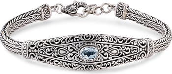 A faceted amethyst centers this ornate filigree bracelet handcrafted in sterling silver with timeless Balinese artistry.