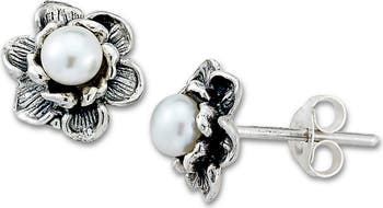 An elegant floral design and glossy freshwater pearl shapes these stud earrings handcrafted from antiqued sterling silver.