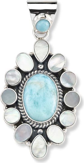 A lacy blue larimar cabochon is haloed by shimmery mother-of-pearl on this handcrafted sterling silver pendant.