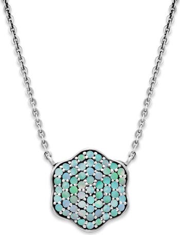 Pavé-set opal gemstones lend a rich, ethereal sparkle to the scalloped-edge pendant, suspended from a delicate sterling silver chain for lasting luster.