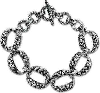 Basketweave textures are etched into antiqued sterling silver to create a unique chain bracelet with tapered oval shaped links.