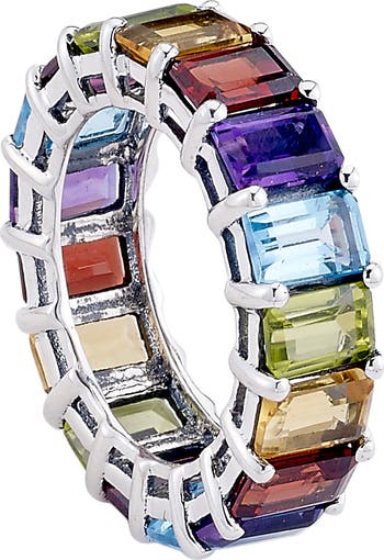 Colorful baguette-cut stones add whimsical sparkle to this sterling silver eternity band.